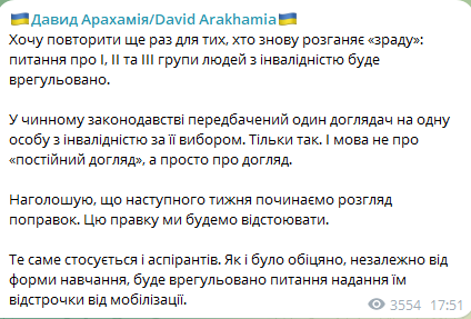 "Те саме стосується і аспірантів. Як і було обіцяно, незалежно від форми навчання буде врегульовано питання надання їм відстрочки від мобілізації",— додав Арахамія.