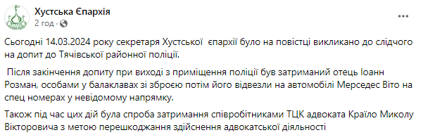 У Єпархії розповіли, що сьогодні секретаря Хустської єпархії отця Іоанна Розмана за повісткою викликали до слідчого на допит до Тячівської районної поліції.