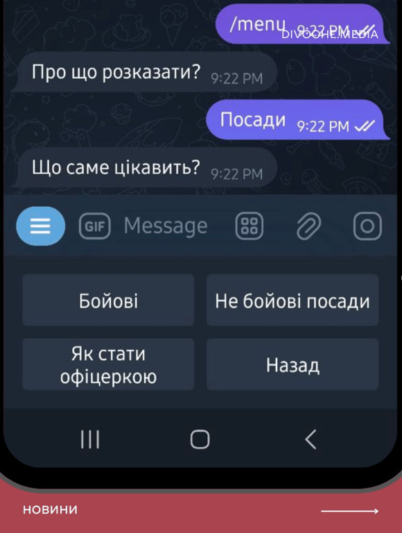 Чат-бот надає інформацію про підготовку до служби, основи тактичної медицини, а також пропонує перелік платформ для пошуку військових вакансій та відповіді на юридичні запитання. Ви також матимете можливість ознайомитися з реальними історіями жінок-захисниць, які поділяться своїм досвідом мобілізації та служби в армії.